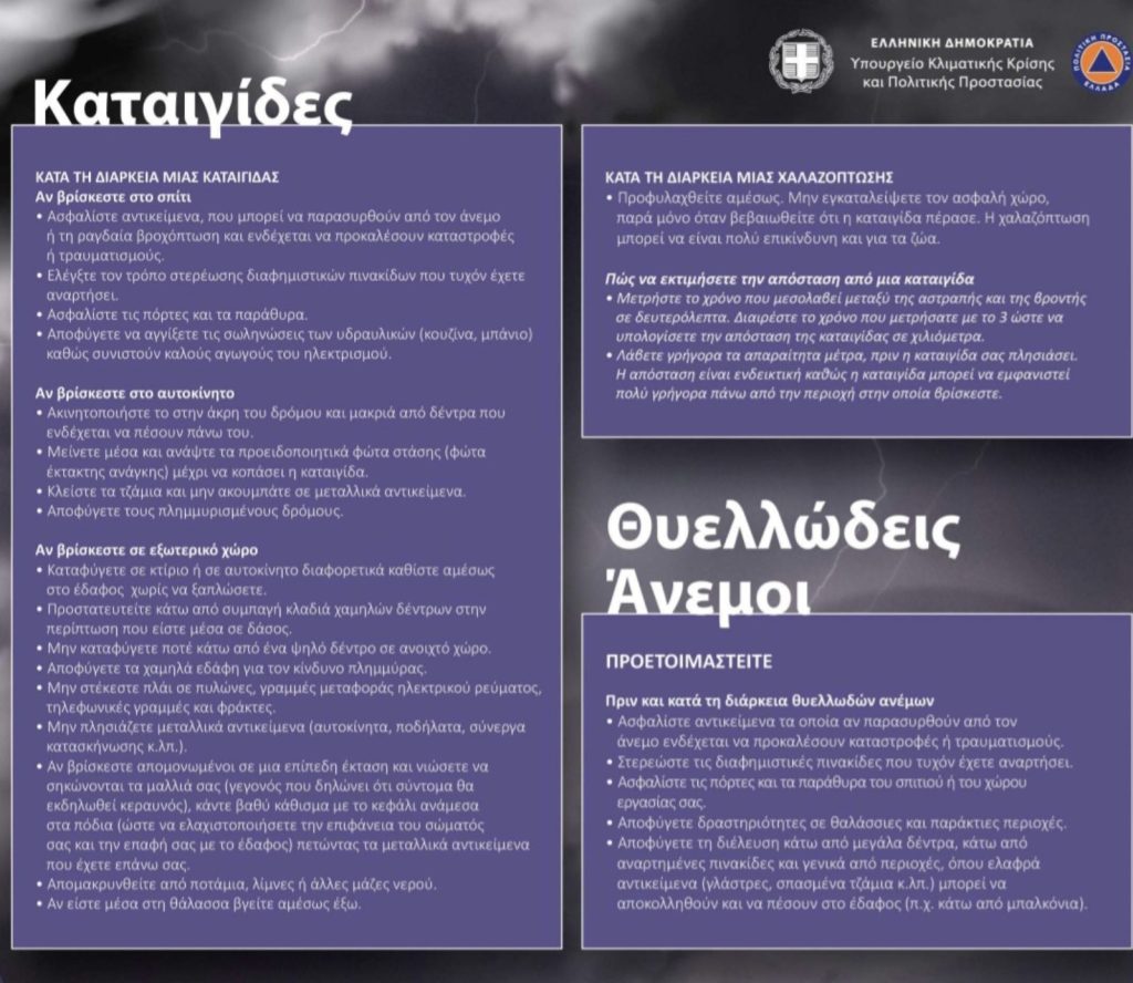 Σας ενημερώνουμε επίσης ότι στην ιστοσελίδα της Περιφέρειας Νοτίου Αιγαίου (https://www.pnai.gov.gr/archives/16891) υπάρχουν αναρτημένες Οδηγίες Προστασίας από Έντονα Καιρικά Φαινόμενα και από έκτακτα φαινόμενα καταστροφών (φυσικών και τεχνολογικών) καθώς και σχετικές πληροφορίες με σκοπό την πληρέστερη ενημέρωση των πολιτών και στην ιστοσελίδα της Γενικής Γραμματείας Πολιτικής Προστασίας υπάρχει αναρτημένο έντυπο με οδηγίες αυτοπροστασίας από φυσικές καταστροφές. Το κείμενο περιλαμβάνει απλές οδηγίες και χρήσιμες πληροφορίες για προστασία από κινδύνους όπως οι σεισμοί, οι κατολισθήσεις, οι δασικές πυρκαγιές, τα έντονα καιρικά φαινόμενα κ.ά. στον ακόλουθο σύνδεσμο: