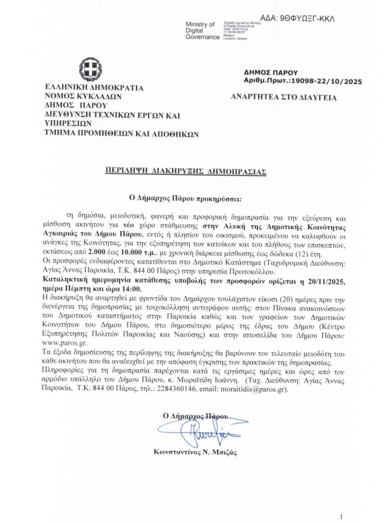 Διακήρυξη δημοπρασίας για την εξεύρεση και μίσθωση ακινήτου για νέο χώρο στάθμευσης στην Αλυκή της Δημοτικής Κοινότητας Αγκαιριάς του Δήμου Πάρου
