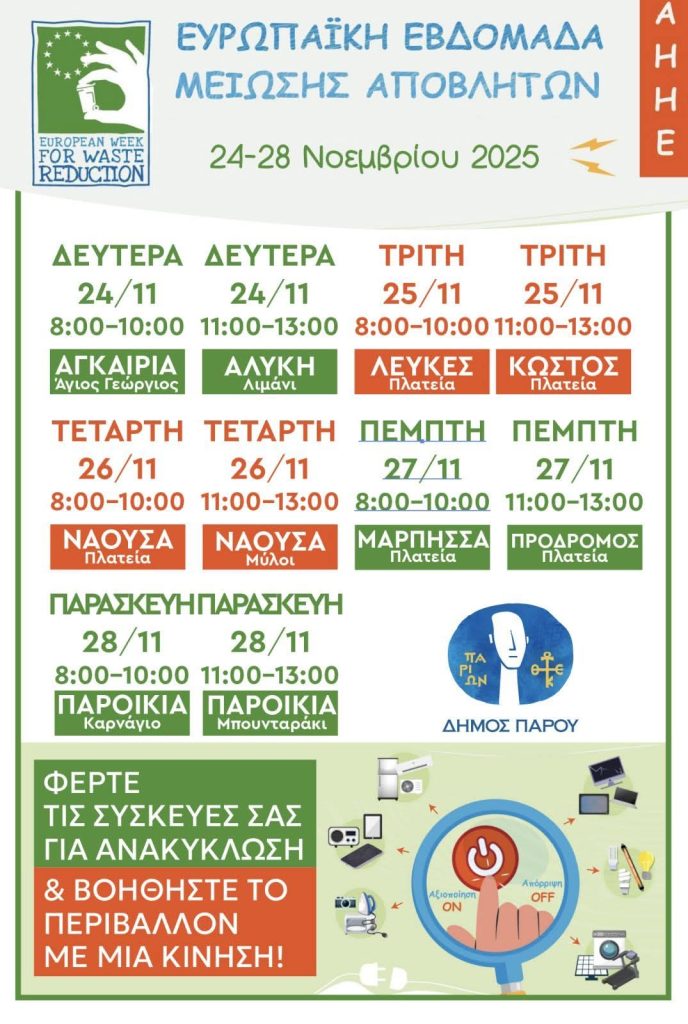 Συμμετοχή του Δήμου Πάρου στην Ευρωπαϊκή Εβδομάδα Μείωσης Αποβλήτων στις 24 – 28 Νοεμβρίου 2025