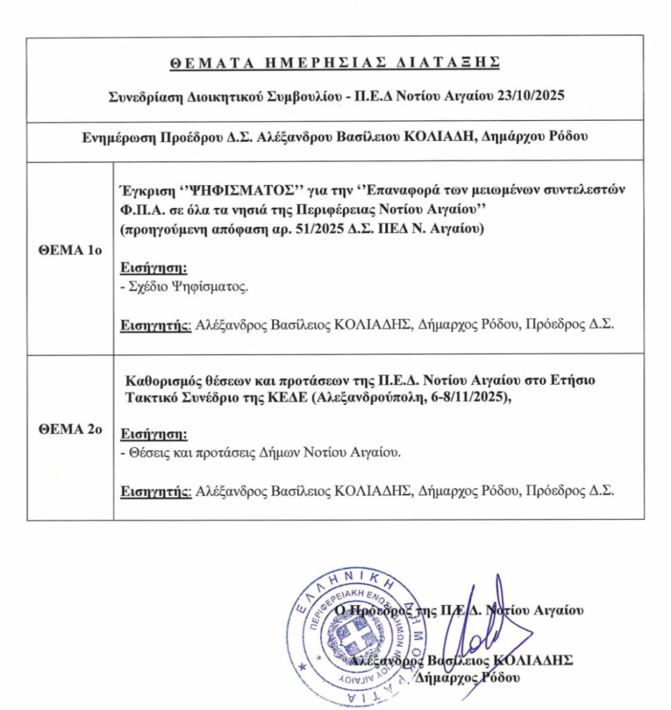 Κεντρικό θέμα της συνεδρίασης αποτέλεσε το Σχέδιο Ψηφίσματος για την Επαναφορά των Μειωμένων Συντελεστών Φ.Π.Α. σε όλα τα νησιά της Περιφέρειας Νοτίου Αιγαίου, ένα αίτημα δίκαιο και απολύτως τεκμηριωμένο, που αντανακλά την ανάγκη στήριξης των νησιωτικών κοινωνιών και οικονομιών.