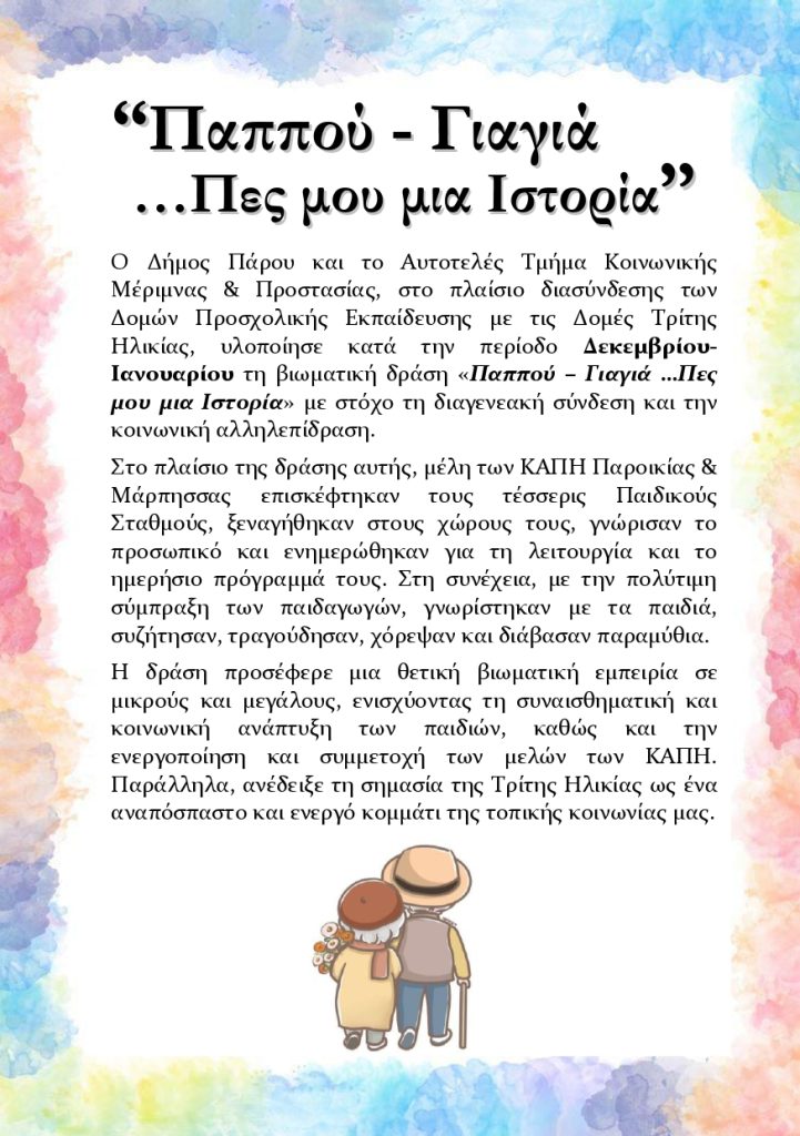 Ο Δήμος Πάρου και το Αυτοτελές Τμήμα Κοινωνικής Μέριμνας & Προστασίας, στο πλαίσιο διασύνδεσης των Δομών Προσχολικής Εκπαίδευσης με τις Δομές Τρίτης Ηλικίας, υλοποίησε κατά την περίοδο Δεκεμβρίου–Ιανουαρίου τη βιωματική δράση «Παππού – Γιαγιά …Πες μου μια Ιστορία» με στόχο τη διαγενεακή σύνδεση και την κοινωνική αλληλεπίδραση.