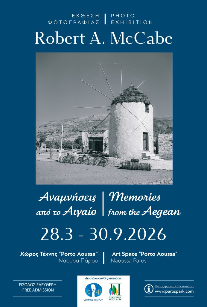 Από τις 28 Μαρτίου έως τις 30 Σεπτεμβρίου 2026, στον χώρο τέχνης Porto Aoussa στη Νάουσα Πάρου, φιλοξενείται η έκθεση «Αναμνήσεις από το Αιγαίο» του διεθνούς φήμης φωτογράφου Robert A. McCabe, με 82 επιλεγμένες φωτογραφίες που ο ίδιος ο δημιουργός επέλεξε ειδικά για την Πάρο, σε συνεργασία με τον επιμελητή της έκθεσης Κώστα Βιδάκη.