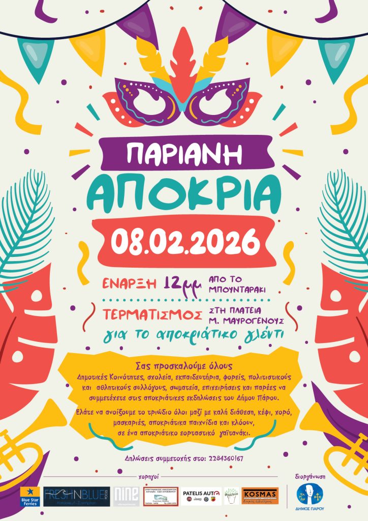 Σας προσκαλούμε όλους, Δημοτικές Κοινότητες, σχολεία, εκπαιδευτήρια, φορείς, πολιτιστικούς και αθλητικούς συλλόγους, σωματεία, επιχειρήσεις και παρέες να συμμετέχετε στις αποκριάτικες εκδηλώσεις του Δήμου Πάρου.