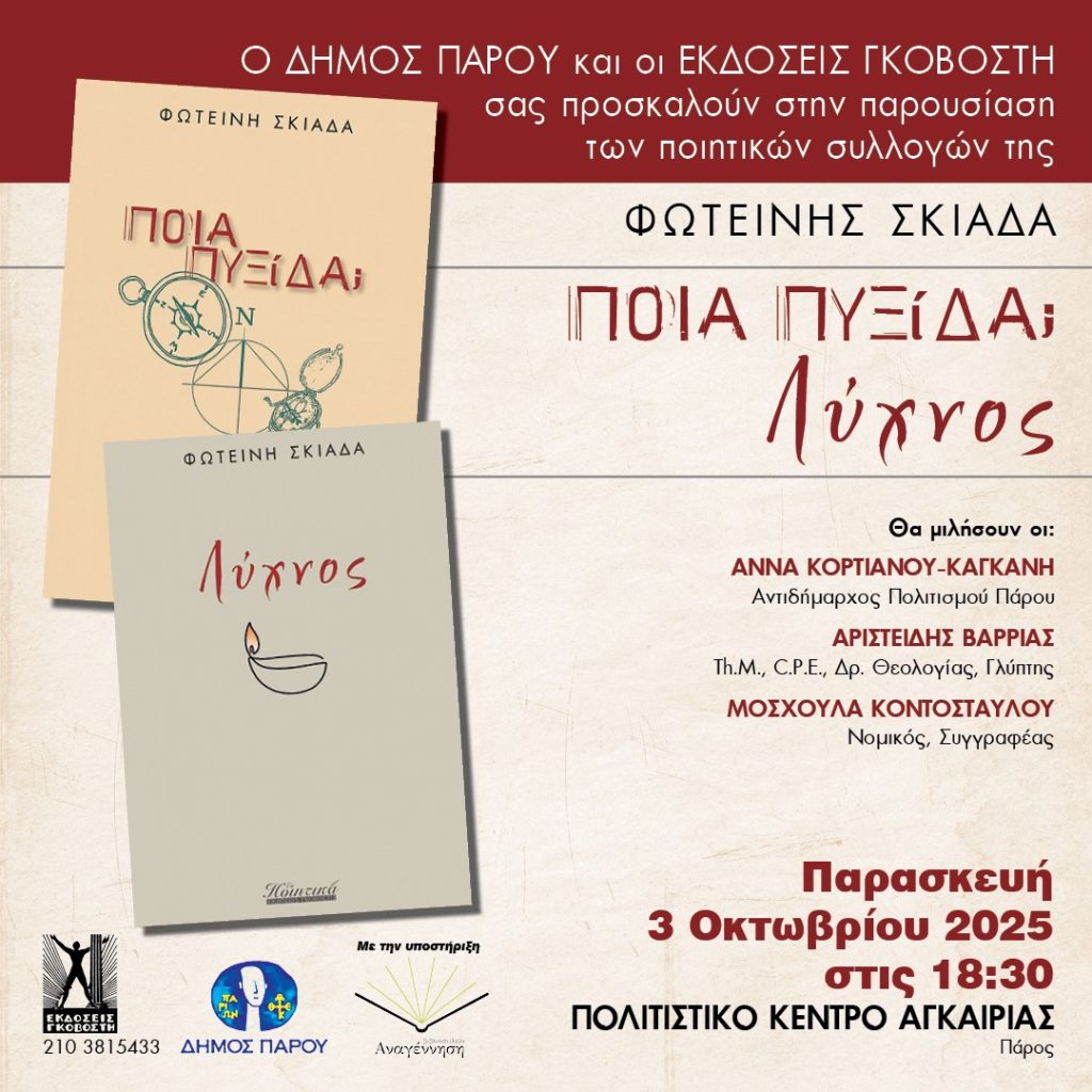 Ο Δήμος Πάρου και οι Εκδόσεις Γκοβόστη σας προσκαλούν στην παρουσίαση των ποιητικών συλλογών της Φωτεινής Σκιαδά, ΠΟΙΑ ΠΥΞΙΔΑ – ΛΥΧΝΟΣ, την Παρασκευή 3 Οκτωβρίου 2025 στις 18:30 στο Πολιτιστικό Κέντρο Αγκαιριάς.